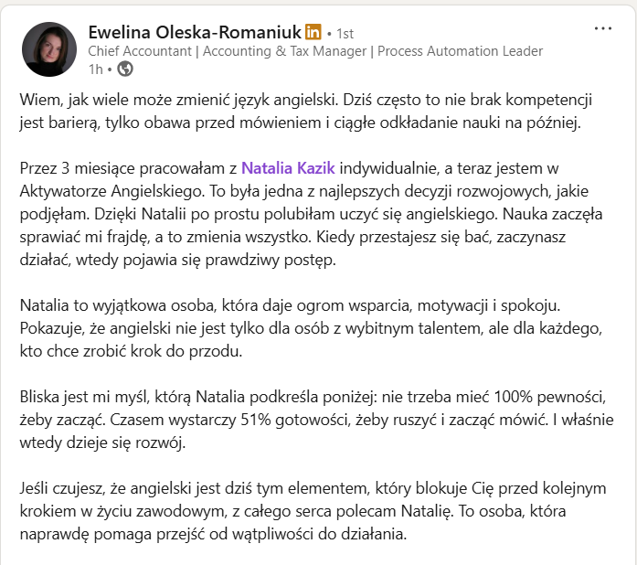 (prowadzenie procesów rekrutacyjnych z kandydatami niemówiącymi po polsku nie stanowi już dla mnie większej trudności ani dużego stresu, co wydawało się niemal nierealne zanim podeszłam do kursu) Polecam wszystkim gorąco 🙂